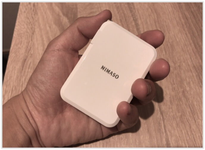 「Nimaso TC-063」は手のひらに収まるサイズ感です。USB急速充電器は大きいイメージがあるかもしれませんが、持ち運びしやすいサイズに設計されています。