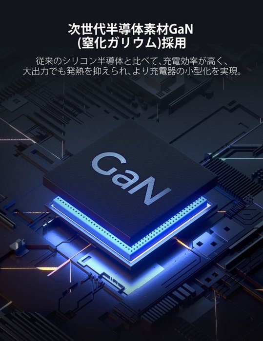 最新の半導体素材である「窒化ガリウム(GaN)」導入することで、充電器からの発熱をさらに抑えることに成功しています。それにより本体サイズが驚くほどコンパクトになったUSB充電器です。