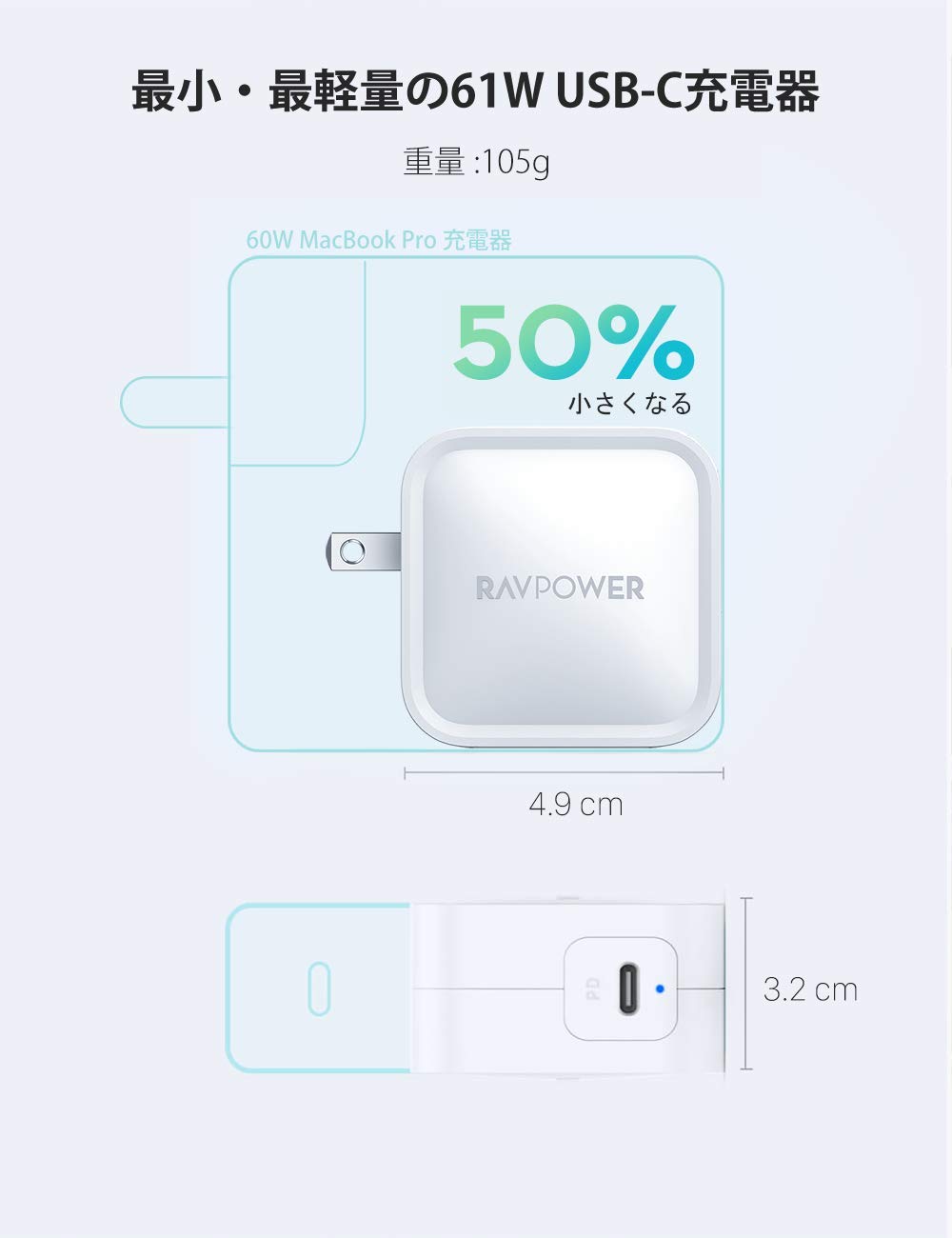 RAVPower RP-PC105は他製品に比べてコンパクトながらも、最大61WのPD対応急速充電が可能でUSB-CとUSB-Aの2ポートを搭載している超便利な充電器です。
