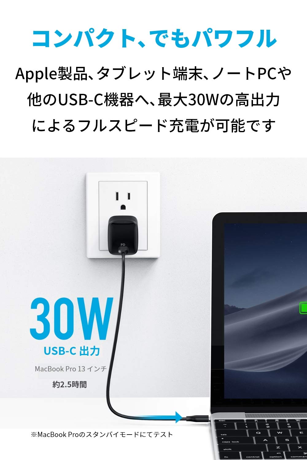 出力は最大30Wで通常のUSB充電器が約5Wなので、6倍の出力を誇ります。約2倍の充電スピードでお使いのデバイスを充電することが可能です。