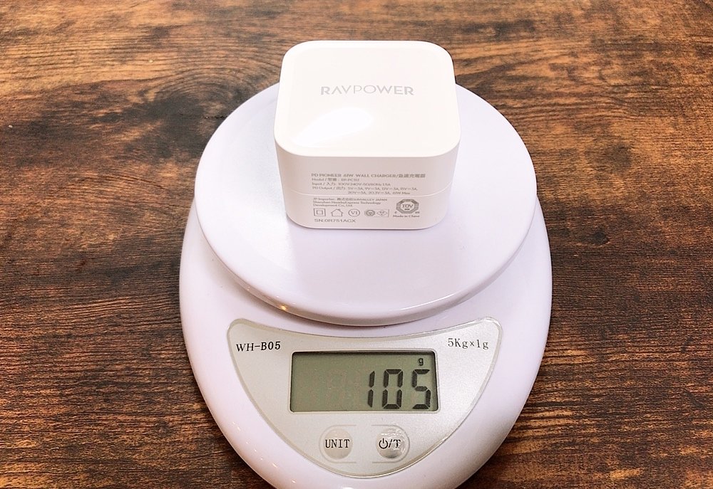 USB急速充電器 RP-PC120の重量はなんと「たった58g」という軽さ。MacBookAirの純正充電器の重さが「約106g」なので、半分の重量しかありません。
