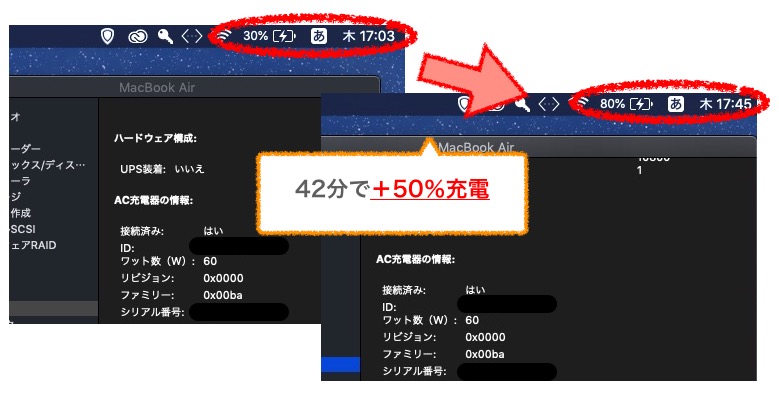 実際に充電速度を計測してみた結果はこちら。42分間で「+50%」も充電することができました!